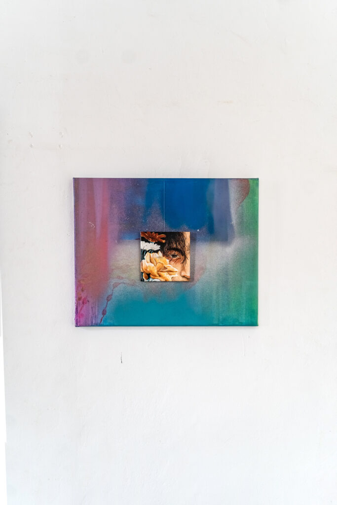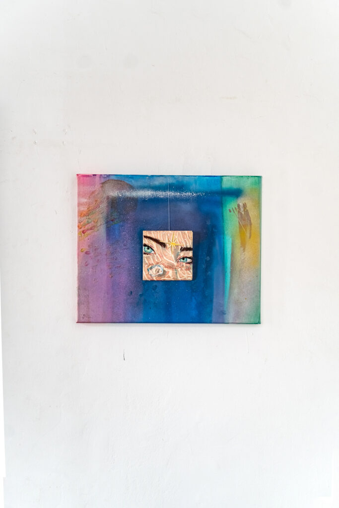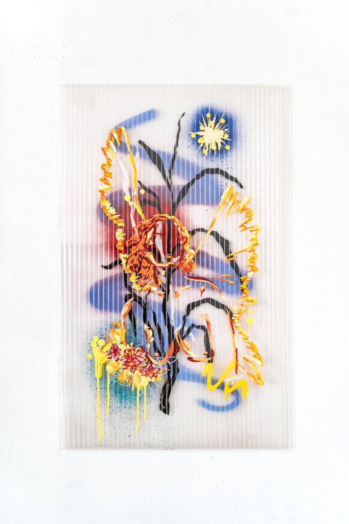 Una figura femenina con alas se recorta sobre una superficie transparente, pintada por ambos lados. ...